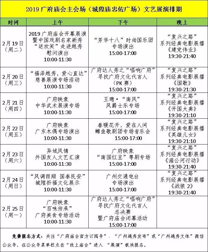 广府映象系列展演特设中华武术、广东木偶、粤剧、“百味传承”广府美食专场,以丰富的形式展现广府文化的魅力。“风调雨顺?国泰民安”城隍祈福文化展示让广大市民进一步了解城隍文化和其中蕴含的人文底蕴。另外,“复兴之路”系列经典电影展播为观影爱好者带来“影视之夜”,《建党伟业》《国歌》《开国大典》等热门电影精彩放映,户外观影的体验不可错过。今年庙会将继续为民众带来充满广府味、民俗味、文化味的新春活动,展示文化融合的繁荣景象,兑现不变的幸福承诺。